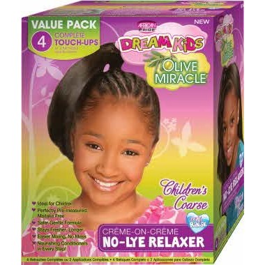 African Pride Dream Kids Olive Miracle Relaxer Kit is formulated exclusively for children’s delicate hair and sensitive scalp, Dream Kids Anti-Breakage No-Lye Relaxer System Olive Miracle formula leaves hair softer, silkier and more manageable than ever before. Kit contains: Instruction Sheet, Gloves & Mixing Stick, Herbal Infusion Pack, Liquid Activator, Conditioning No-Lye Creme Relaxer, Neutralizing Shampoo, Detangling Moisturizing Conditioner