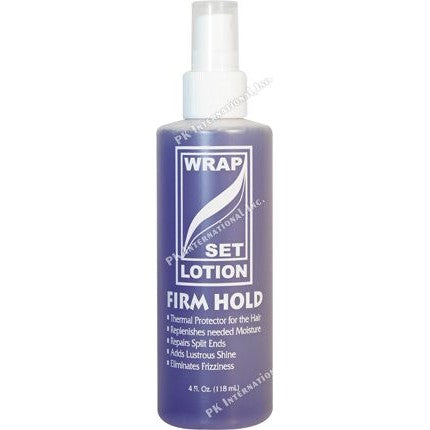 AFRICAN ESSENCE WRAP/SET LOTION FIRM HOLD 4oz This Wrap Set Lotion provides maximum styling ability, control, full body and sheen as it protects the hair against the heat of hair dryers, curling irons and other heat styling appliances. The special blend of conditioners and moisturizers penetrates the hair strands to repair split ends, seal in moisture and strengthens the hair.
