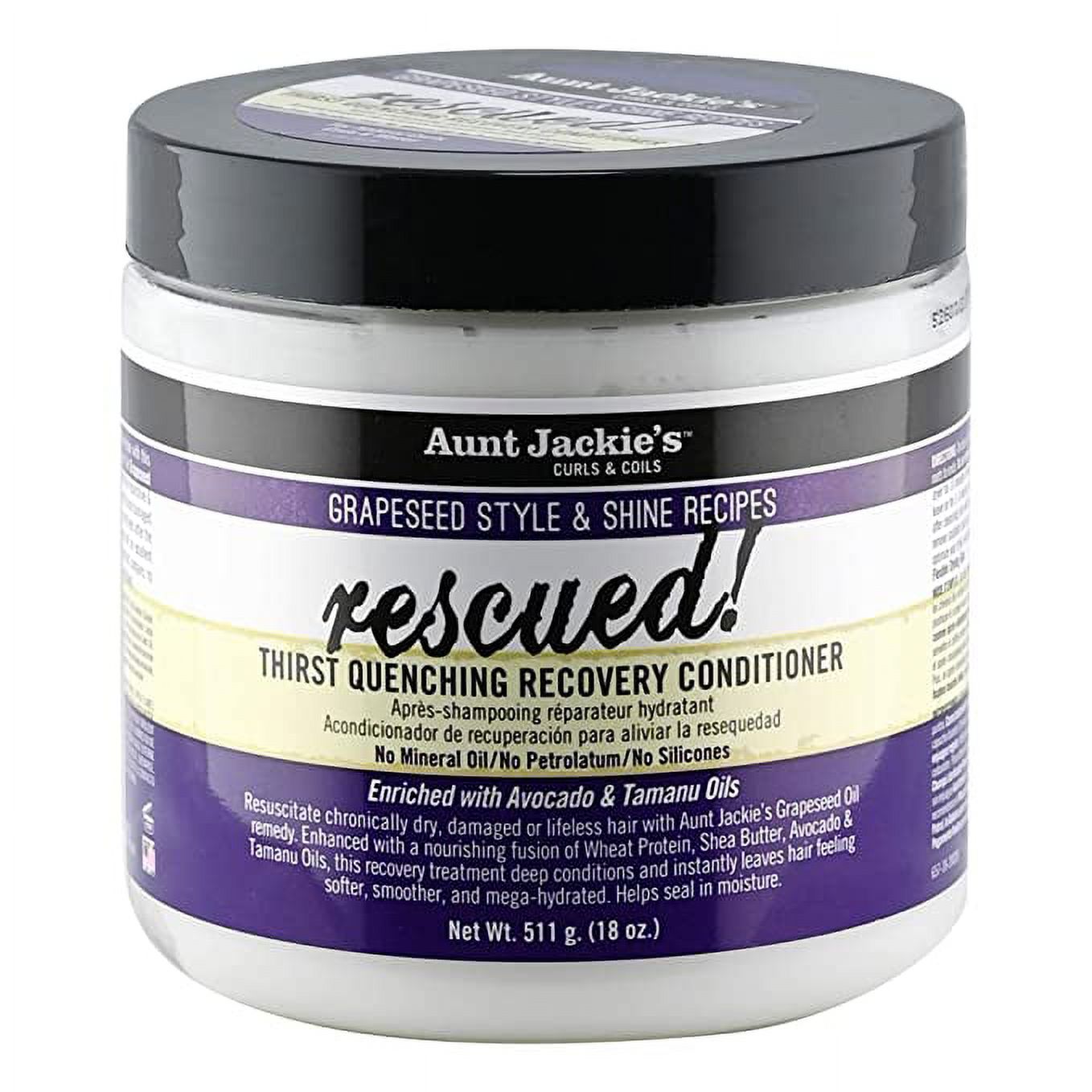 Expertly formulated with grapeseed oil, Aunt Jackie's Rescued Thirst Quenching provides intense hydration for dry and damaged hair. Rich in antioxidants and vitamin E, grapeseed oil nourishes and strengthens hair, leaving it smooth, soft and protected against breakage. Say goodbye to thirsty hair with Aunt Jackie's grapeseed rescue!