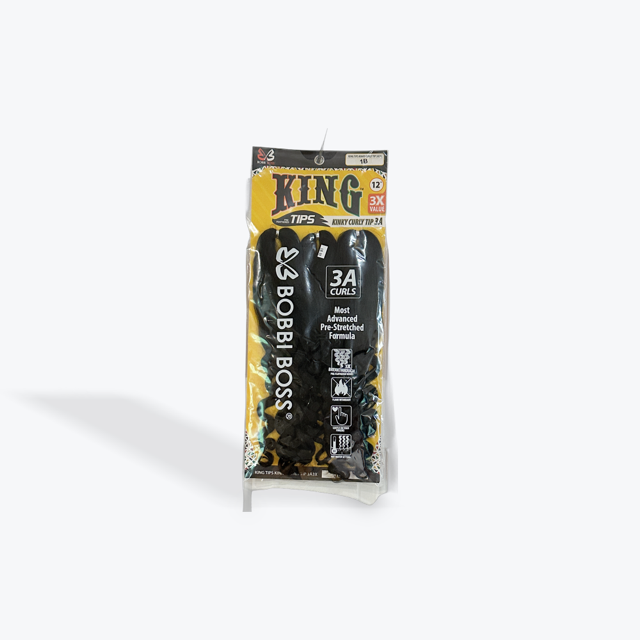 Introducing the BOBBI BOSS KINKY CURLY TIP 12" 1 - an exquisite addition to our professional cosmetics range. This product image description showcases a sleek, black package featuring uniquely designed king condoms.