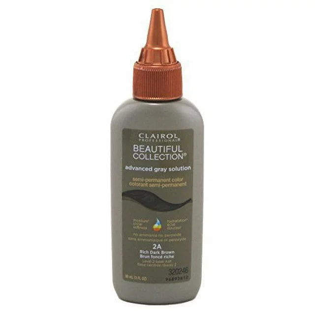 Introducing the Clairol Beautiful Collection Rich Dark Brown 2A 3oz: the ultimate solution for achieving stunning, salon-quality hair color from the comfort of your own home. Elevate your beauty routine with this exceptional product that guarantees luscious and radiant locks, all in a convenient 3oz bottle. Designed to cater to the modern woman's desire for flawless hair, this hair color offers a mesmerizing shade of rich dark brown, adding depth and dimension to your tresses. Whether you're looking to cover grays or simply revamp your look, the Clairol Beautiful Collection is the perfect choice for achieving a natural and vibrant result. The product image showcases this professional-grade hair color, proudly placed atop a counter. Its captivating brown hue and sleek black writing on the side exude a sense of luxury and sophistication. This visually striking packaging is a testament to the high-quality, reliable performance that awaits you inside the bottle. Belonging to the esteemed cosmetics category, the Clairol Beautiful Collection is a must-have addition to your beauty arsenal. Its easy-to-use formula ensures that even beginners can effortlessly achieve salon-worthy results, saving you time and money. Say goodbye to pricey salon appointments and hello to the convenience of achieving your dream hair color in the comfort