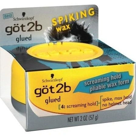 GOT 2B SPIKING WAX Break the laws of styling with wax that defies gravity with got2b Glued Spiking Wax. Screaming hold locks in style, while the lightweight wax leaves no flaking and no white residue. This long-lasting styling wax lasts all day and lets you style your way--from classic to outrageous. Got some length? This invincible styling wax gives crazy hold for even your extreme 'do without helmet head. Dare to be glued!