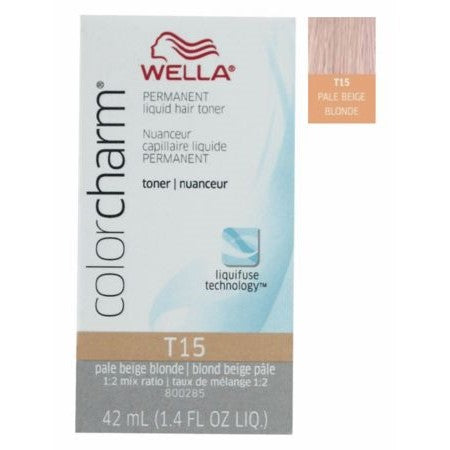 WELLA PERMANENT LIQUID HAIR TONER BLOND BEIGE PALE T15Vibrant, long-lasting, fade-resistant results,Long-lasting, true-to-tone color,Economical 1:2 mix ratioWella Color Charm Permanent Liquid Hair Toner with Liquidfuse Technology saturates, penetrates and fuses with the hair to deliver vibrant color that is exceptionally fade resistant. The extra mild formulation is ideal for creating delicate shades of blonde like platinum and beige and neutralizing unwanted warmth after lightening. Great for toning pure double processed blondes.